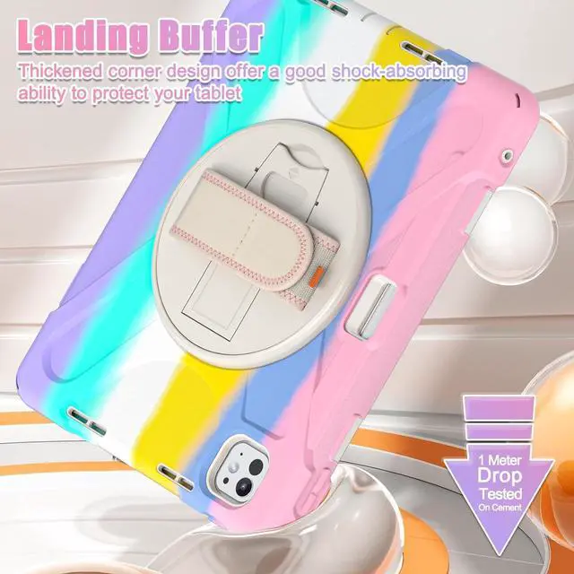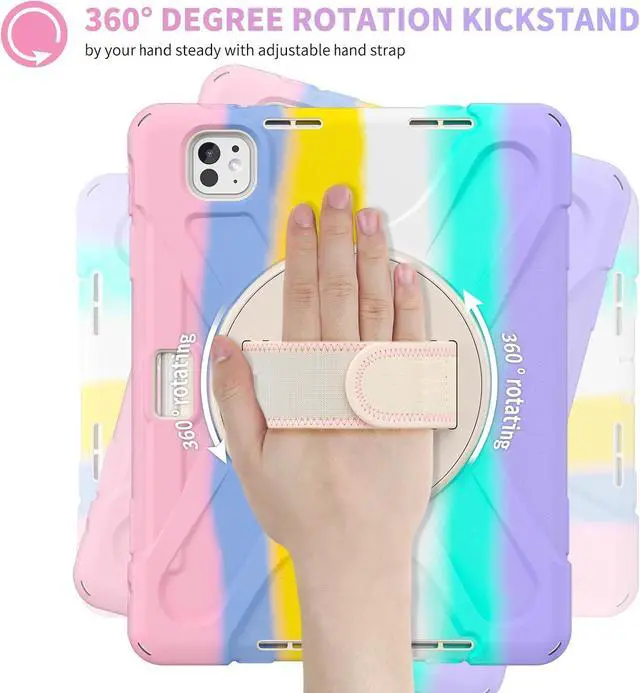 Case for iPad Pro 11-inch (2024) M4 Chip Model A2836 Heavy Duty Rugged Durability Silicone Tablet Cover with 360° Rotating Hand Strap Foldable Hidden Stand & Shoulder Strap, Colorful Pink
