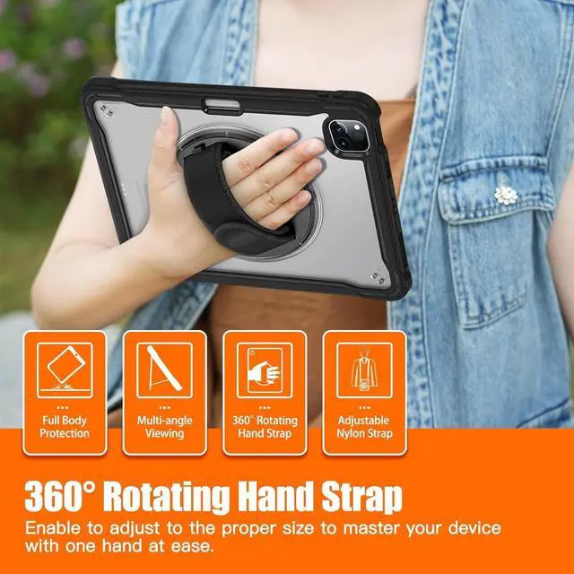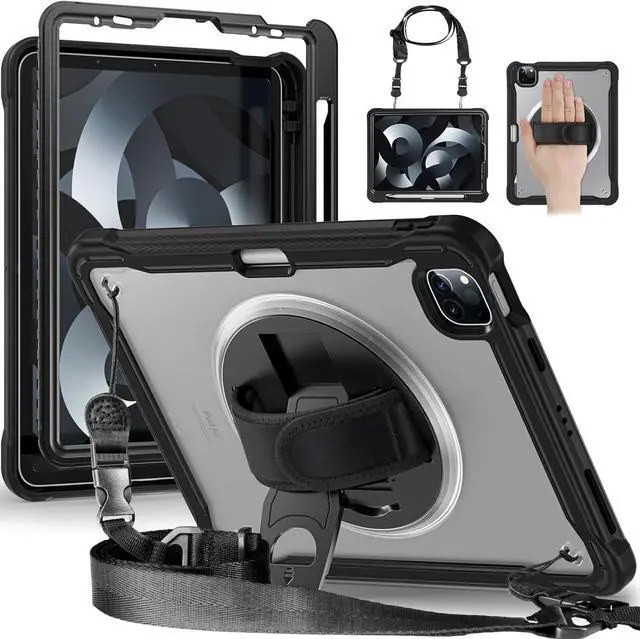 Case for iPad Pro 12.9-inch 2022 6th M2 /2021 (5rd Generation) / iPad Pro 12.9" 4th/3rd Gen Heavy Duty Rugged Shockproof Tablet Cover with 360° Rotating Hand Strap & Shoulder Strap, Black