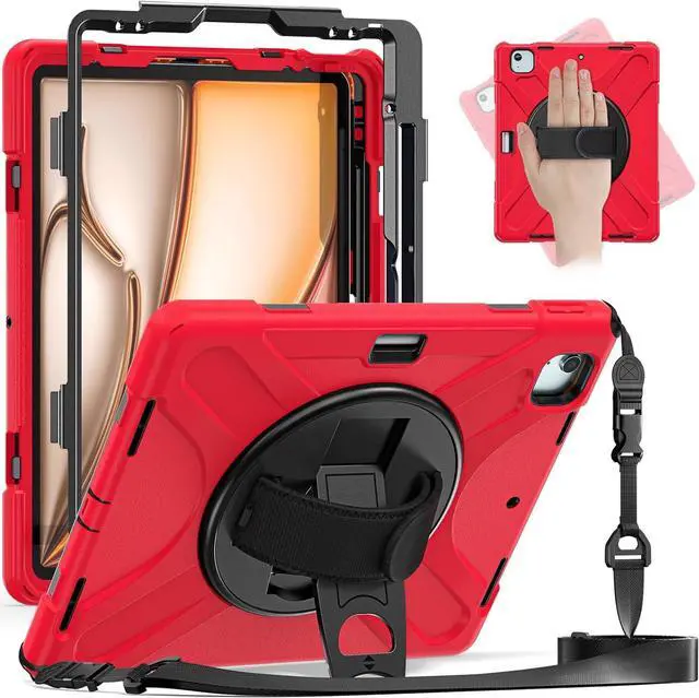 Case for iPad Air 13 inch (2024) M2 Chip Model A2898/A2899 Heavy Duty Rugged Durability Silicone Tablet Cover with 360° Rotating Hand Strap Foldable Hidden Stand & Shoulder Strap, Red