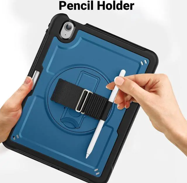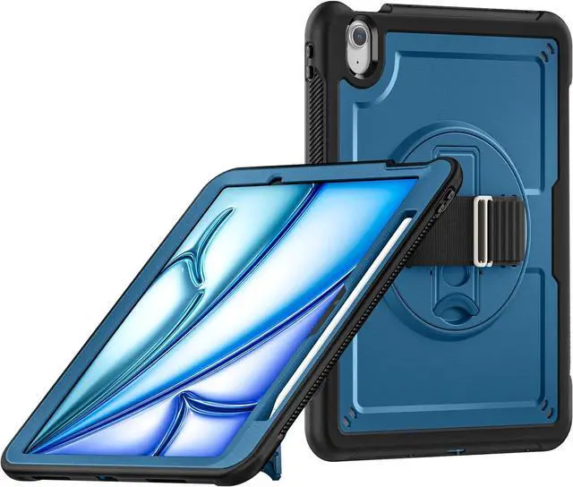 Case for iPad Air (2024) 11-inch M2 Chip Multilayered Rugged Durable Shockproof Tablet Cover with 360° Rotating Hand Strap Foldable Hidden Stand, Navy Blue
