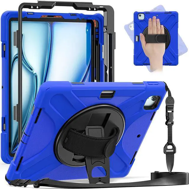 Case for iPad Air 13 inch (2024) M2 Chip Model A2898/A2899 Heavy Duty Rugged Durability Silicone Tablet Cover with 360° Rotating Hand Strap Foldable Hidden Stand & Shoulder Strap, Blue