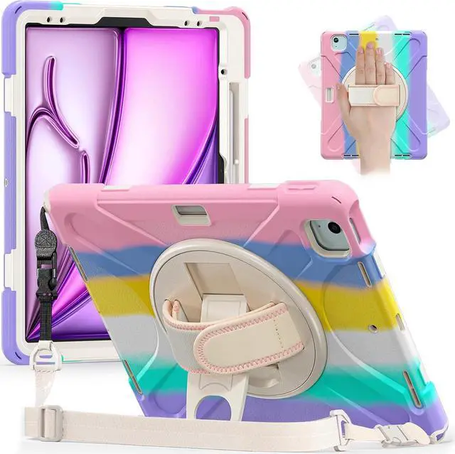 Case for iPad Air 11-inch (2024) M2 Chip Model A2902 Heavy Duty Rugged Durability Silicone Tablet Cover with 360° Rotating Hand Strap Foldable Hidden Stand & Shoulder Strap, Colorful Blue