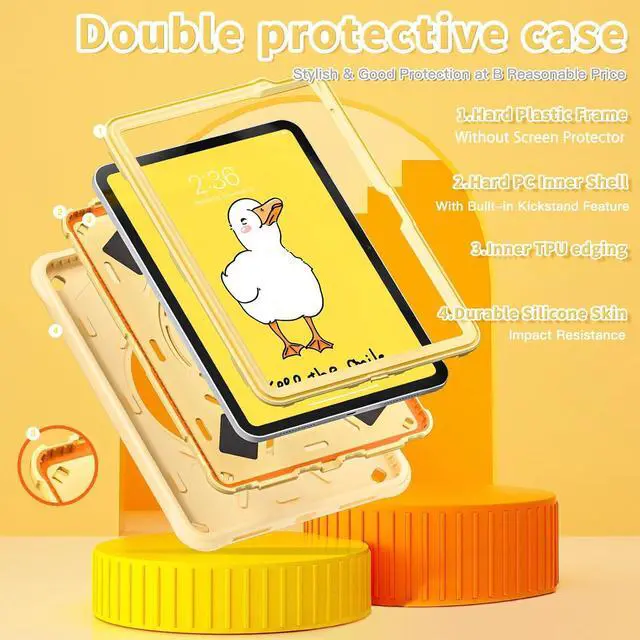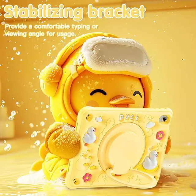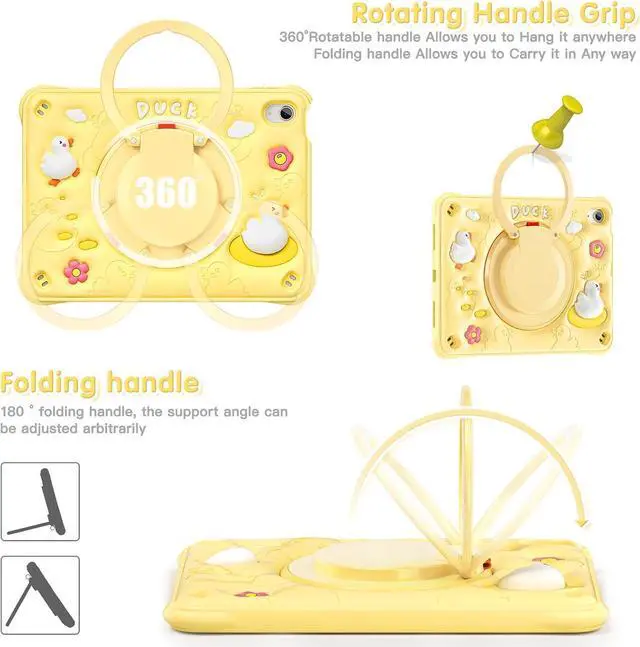 360° Rotating Silicone Hand Strap and Hidden Kickstand: The bottom-mounted, adjustable silicone hand strap provides a secure grip for little hands, while the retractable kickstand offers adjustable viewing angles for hands-free use during learning or play