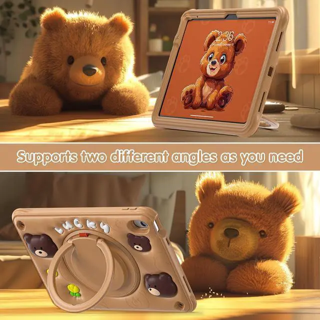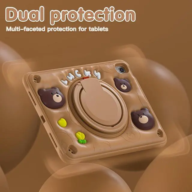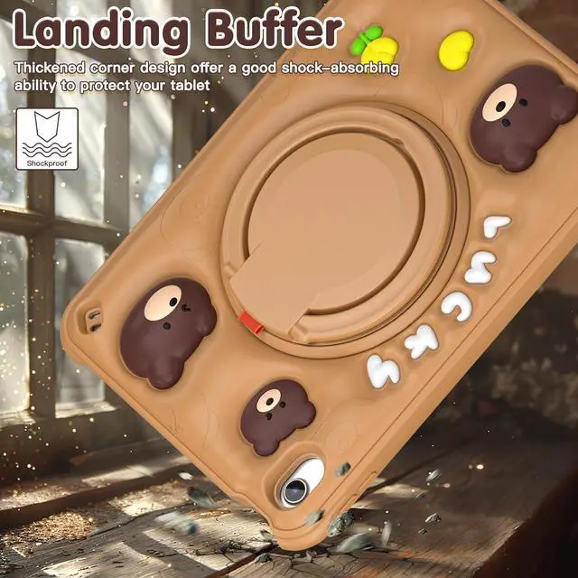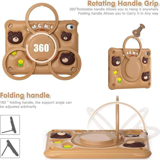 360° Rotating Silicone Hand Strap and Hidden Kickstand: The bottom-mounted, adjustable silicone hand strap provides a secure grip for little hands, while the retractable kickstand offers adjustable viewing angles for hands-free use during learning or play