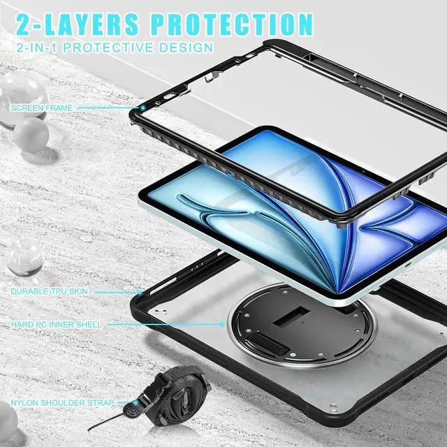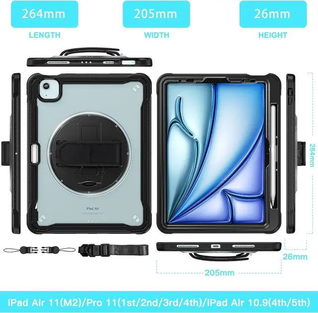 iPad Air 11 inch Case 2024 M2 Chip Dual-Layer Protective Tablet Cover,Lightweight Durable,Shock-Absorbing Corners with 360° Rotating Hand Strap and Hidden Kickstand & Shoulder Strap, Black
