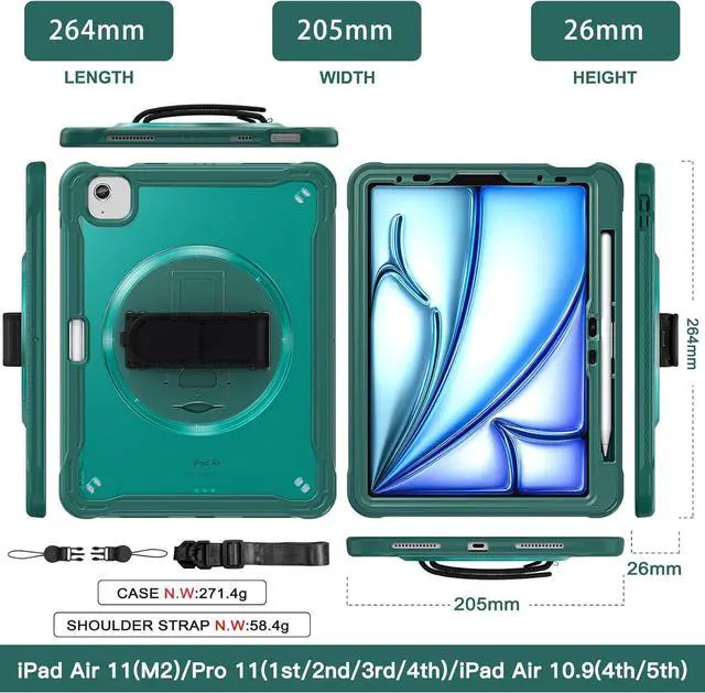 iPad Air 11 inch Case 2024 M2 Chip Dual-Layer Protective Tablet Cover,Lightweight Durable,Shock-Absorbing Corners with 360° Rotating Hand Strap and Hidden Kickstand & Shoulder Strap, Teal