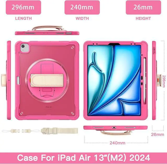 iPad Air 13 inch Case 2024 M2 Chip Dual-Layer Protective Tablet Cover,Lightweight Durable,Shock-Absorbing Corners with 360° Rotating Hand Strap and Hidden Kickstand & Shoulder Strap, Pink