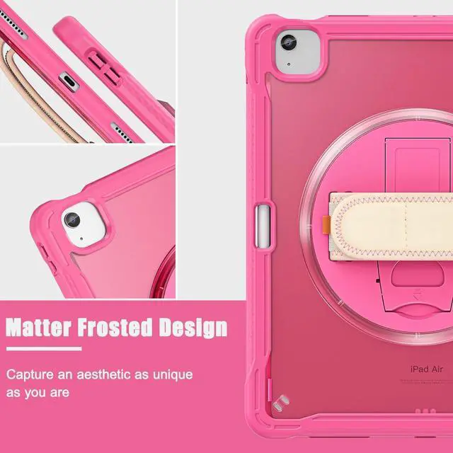 360° Rotating Hand Strap Design: With a 360° rotating hand strap design, this case offers versatile handling options, allowing you to comfortably carry your iPad Air in any orientation, making it ideal for on-the-go use.