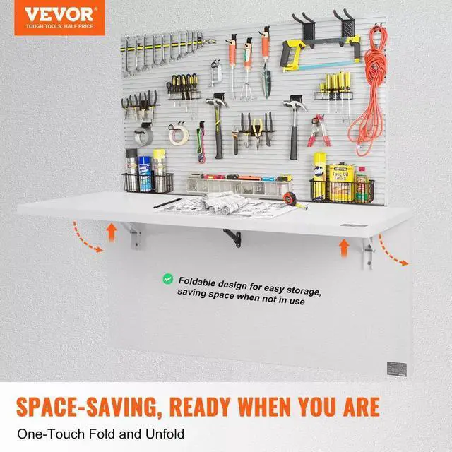 1. This wall mounted folding table effortlessly complements any tool room with its easy-matching design. It's both practical and stylish, maximizing space and providing excellent storage solutions.