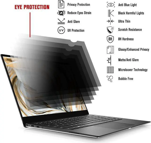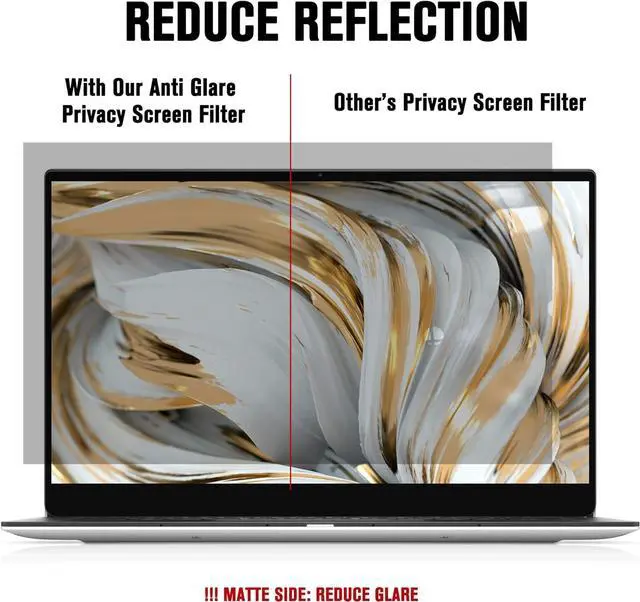 ANTI GLARE/BLUE LIGHT/UV LIGHT/RADIATIONThe matte side of laptop privacy film with anti-glare 80%, anti uv light 96%, anti-blue light 65%, scratch resistant and excellent color transmittance. Reducing eye strain, preventing myopia & dryness, hyperemia and so on, focusing on & effectively improving your work and kid's learning.
