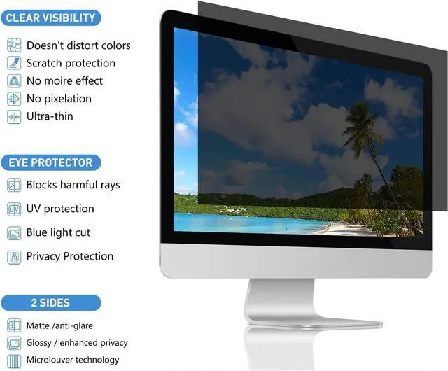 Eye Protector with Double Glossy and Matte Finsh20 privacy screen for monitor protects your eyes by filtering out 96% UV and curbing blue light by 65%. Its a reversible privacy screen filter, giving you the flexibility to choose glossy or matte finish Choose the matte to reduce external glare.