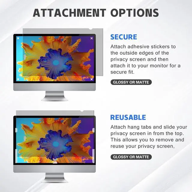 Easy Installation -- includes two, easy-to-attach options - Attachment strips and Slide-mount tabs. Package contains Extra installation kits (option 1 and 2). We guarantee all screen filters have 100% quality due to hand checking.