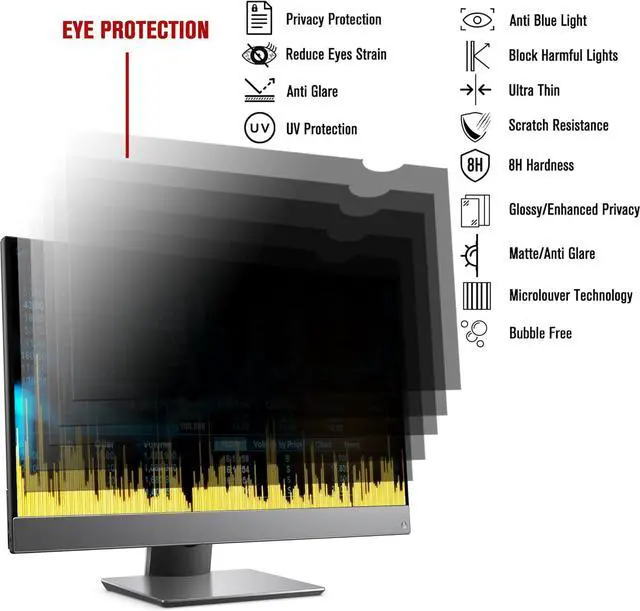 ANTI GLARE/BLUE LIGHT/UV LIGHT/RADIATIONThe matte side of monitor privacy screen with anti-glare 80%, anti uv light 96%, anti-blue light 65%, scratch resistant and excellent color transmittance. Reducing eye strain, preventing myopia & dryness, hyperemia and so on, focusing on & effectively improving your work and kid's learning.