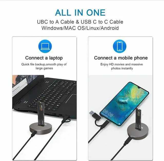 Wide CompatibilityThis M. 2 to USB hard drive case is compatible with Windows/Mac OS/Linux/Android systems, and compatible with PC, smart phone, computer, smart TV and more. One cable has both USB-A port and USB-C port, easy to use. The maximum capacity up to support 2TB.