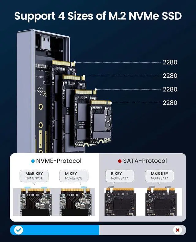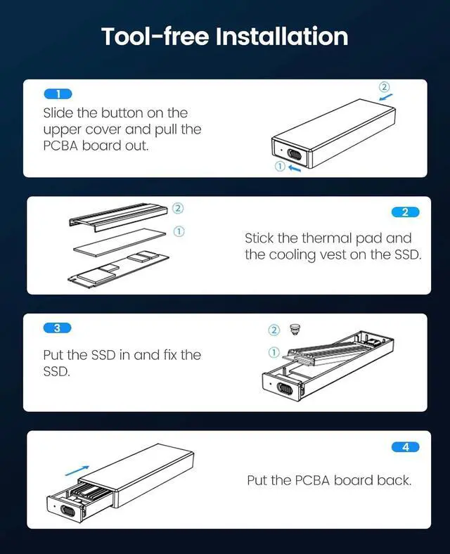 Tool-Free DesignTool-free M2 case allows for quick and easy installation of your M. 2 NMVe SSD, one-click to open the enclosure, easy to use and portable.