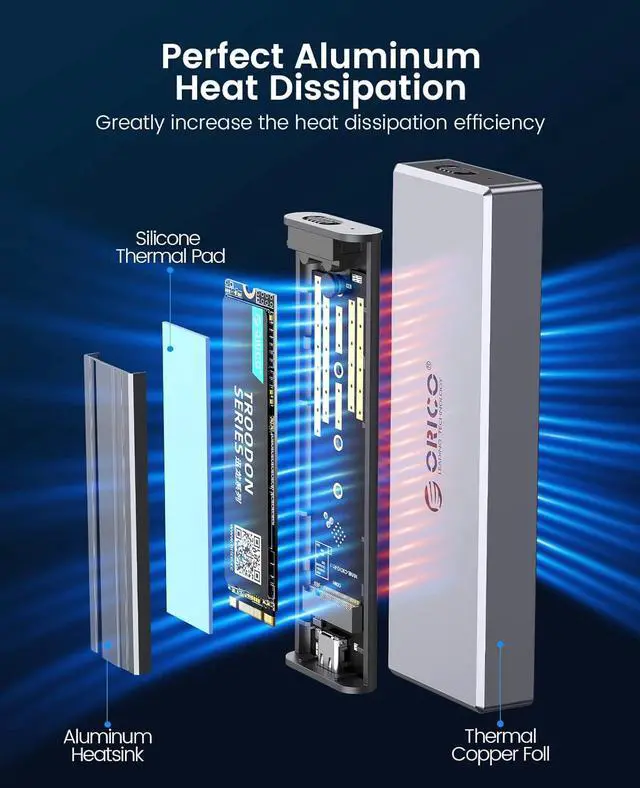 Upgraded Cooling Performance The NVMe USB adapter adopts an upgraded metal heatsink-cooling vest, an aluminum alloy shell, and a long silicone thermal pad to conduct heat quickly.