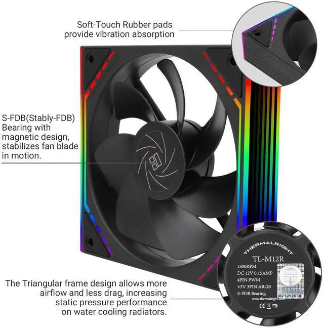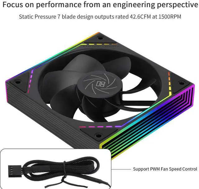 [Unique ARGB Mirror Lighting Effect]The well-designed ARGB infinite frame structure is distributed on both sides of the fan, and the ARGB lines are distributed around the front of the fan, together with the infinite frame ARGB aperture, it can achieve the combination of positive & measured surface ARGB lighting effect, and multiple phantom colourful lighting effects can be achieved under the action of the airflow.
