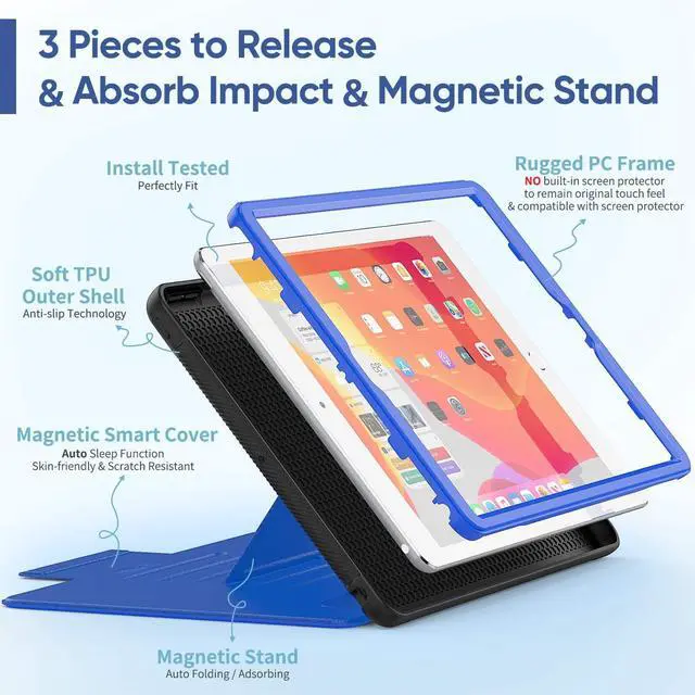 MATERIAL: The case for iPad 10.2 is made from high-grade soft thermoplastic polyurethane and PU leather hard PC frame & the lint lining protecting the display without scratch & dustproof Auto Sleep/Wake convenient cover