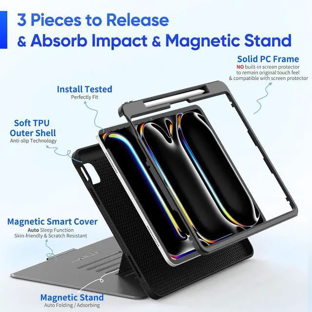 Multi-angles Stand with Magnetic: Case for iPad Pro 13 2024 cover with magnetic-stand offering viewing with 7 adjustable angles for stability and convenience wherever you are. Case for iPad Pro 13'' (M4 chip) 2024 provides convenient viewing/typing angles for play, work, or stream.