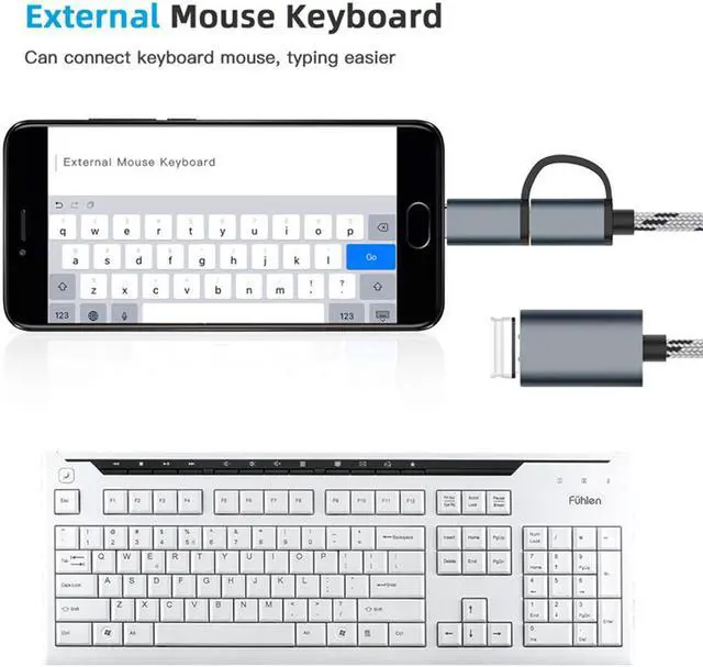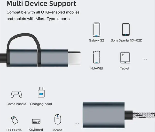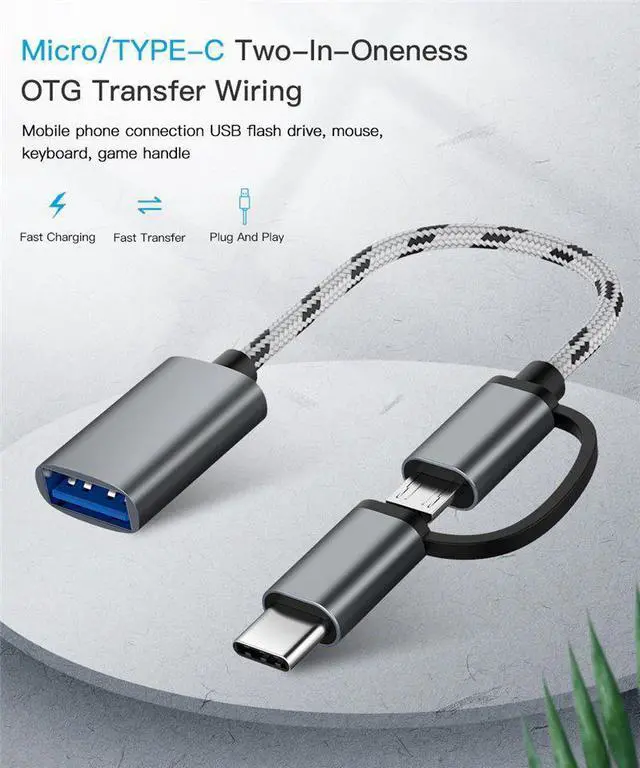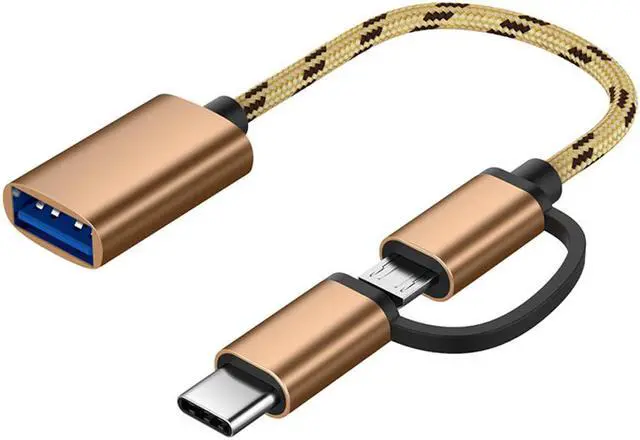 2 in 1 USB 3.0 OTG Cable Nylon Braid Micro USB Type C Data Sync Charge Adapter for Samsung One Plus MacBook USBC Type-C OTG - Golden 1. Type-c+micro 5pin dual-interface OTG cable can be used for TYPE-C mobile phone tablet computer, also for micro 5p mobile phone and tablet computer. 2. Incidentally, the adapter can also convert the micro 5p data cable into the TYPE-C data wire.3. Connect OTG-enabled mobile phones or tablets, external mouse, keyboard, U disk and other devices.Specification:Product length: 17cmInterface type: Type-C Male +Micro USB Male to USB 2.0 FemaleGross weight: 10 gNet weight: 12 gPackaging: BagsProduct Material: Aluminum Alloy Shell, Copper Core Conductor