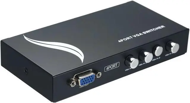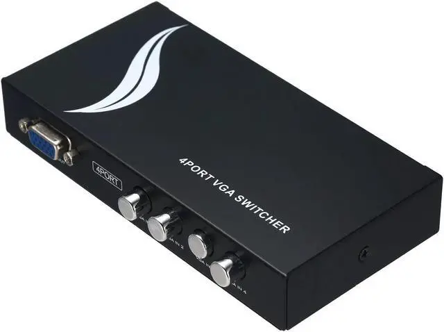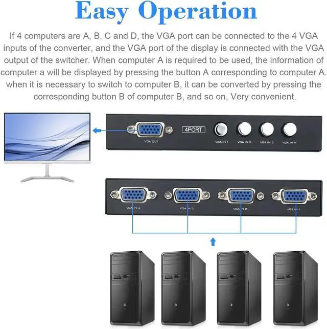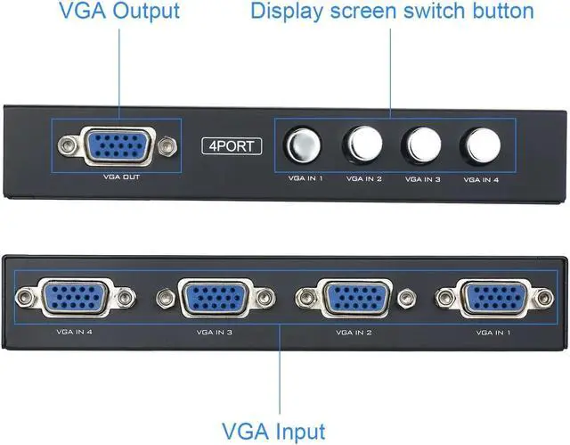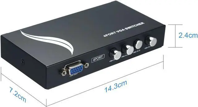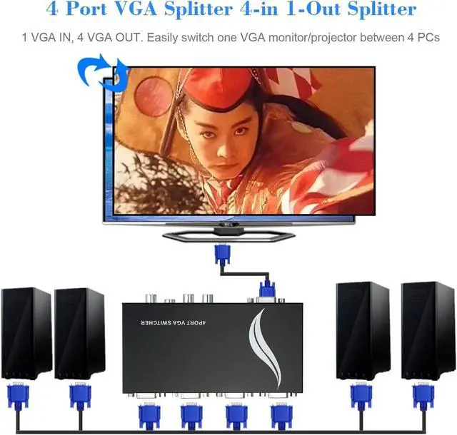Features: 1 VGA IN, 4 VGA OUT. Easily switch one VGA monitor/projector between 4 PCs. High resolution video, Support resolution is up to 1920*1440. No power supply or batteries needed. Easy to install, plug and play. Ideal for public broadcasting, remote monitoring, classroom and training facilities.