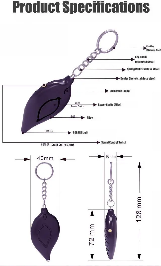 Features: [More protection, safer] Adapting to the elderly/child/student/female Need to seek help in an emergency! CR2025 button battery *2/Super highlight with multi-color LED light Three alarm voices / five kinds of light mode selectable, this product does not provide a strap. [Care everywhere]