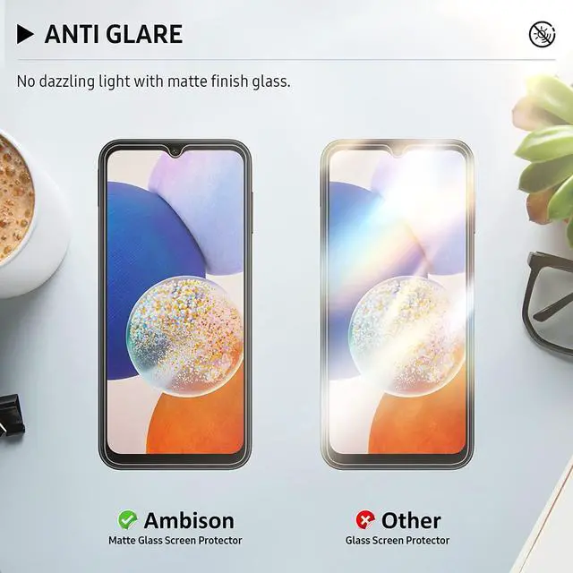 Matte Screen Protector: Samsung Galaxy A14 matte glass screen protector, which also has HD transparency, while enjoying the matte texture, it can also display the HD screen. And effectively prevent strong light, glare, so that the mobile phone screen has a comfortable environment.