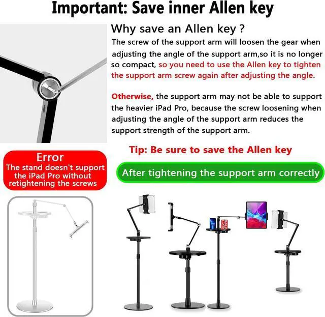 Strong support: The round metal base weighs 6.8 pounds and can firmly support your large tablet. Rotating the folding arm provides you with any angle. After adjusting the angle, please use the accessory wrench to tighten the folding arm. The screws of the folding arm will become loose due to the adjustment angle.