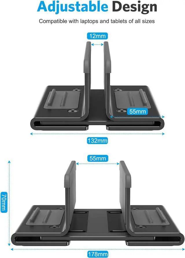 ADJUSTABLE WIDTH: The adjustable slots enables it to accommodate various laptops 0.47 inch (12mm) to 2.16 inches (55mm) in width, such as MacBook, Microsoft Surface, Samsung, Lenovo, etc.