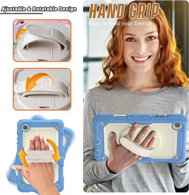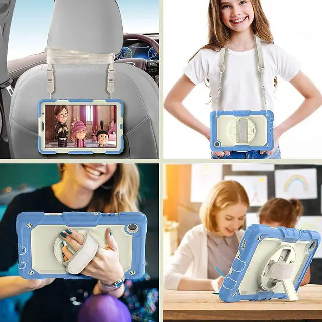 ?Adjustable Shoulder Strap + Hand StrapAdjustable shoulder grip can be slanted and release your hands completely.This function is used for traveling, restaurant ordering, home product introduction, engineer outdoor operation, teacher, etc. and even hang it on your car seat.Also, strap allows to hang up your tablet behind car seat for entertainment for kids.