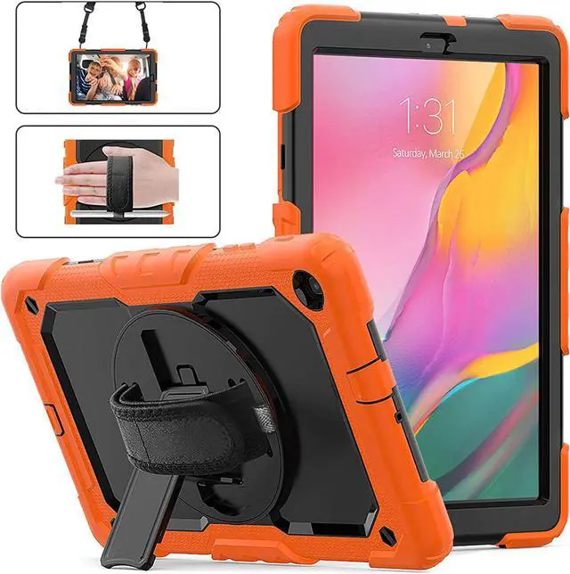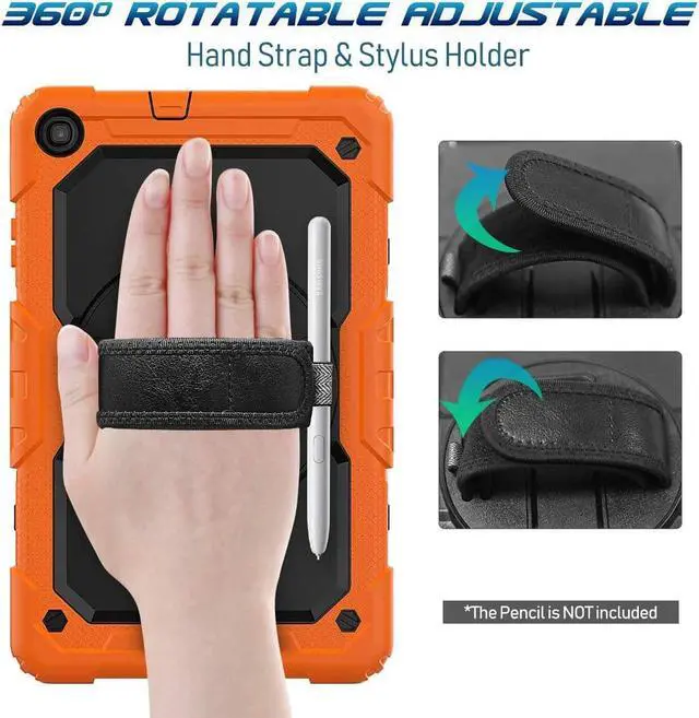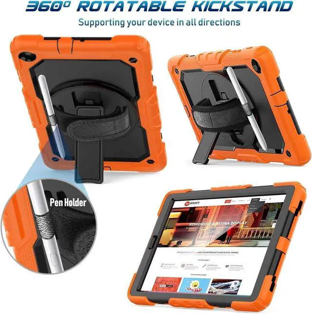Galaxy Tab A 10.1 2019 Case with Pencil Holder, [Screen Protector] [360 Stand] [Attachable Shoulder Strap] [Adjustable Hand Strap] Rugged Case for Samsung Tab A 10.1 SM-T510/T515 Tablet Orange