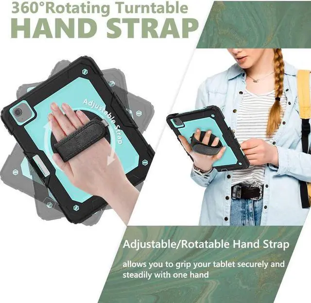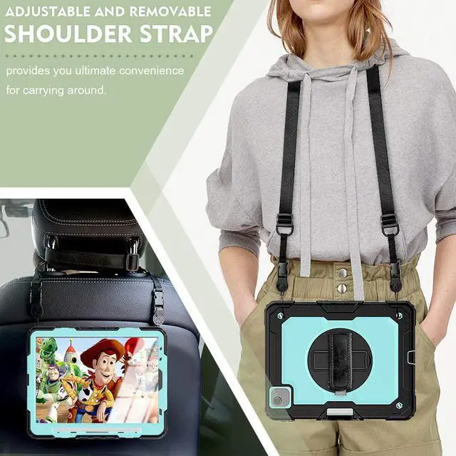 ?Adjustable Shoulder Strap + Hand StrapAdjustable shoulder grip can be slanted and release your hands completely.This function is used for traveling, restaurant ordering, home product introduction, engineer outdoor operation, teacher, etc. and even hang it on your car seat.Also, strap allows to hang up your tablet behind car seat for entertainment for kids.