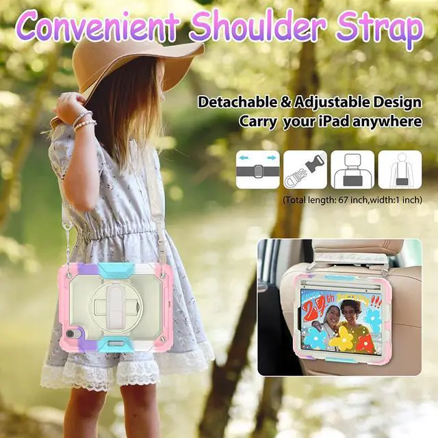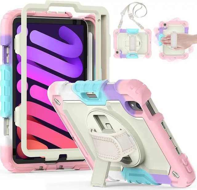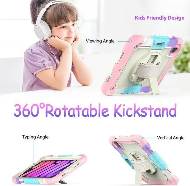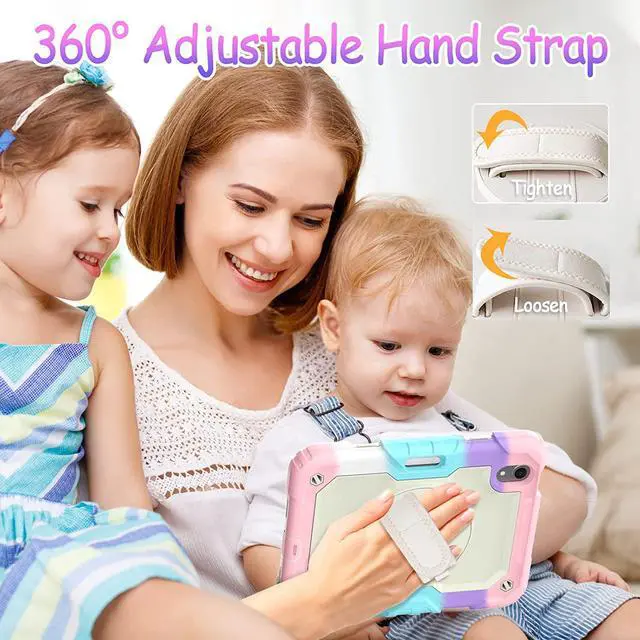 Shoulder Strap & Hand Strap & Rotatable Stand (1) Adjustable-length hand strap makes it easier to use your iPad mini 6th, suitable for adults and childs.(2)Hang the detachable 67 shoulder strap anywhere to provide better entertainment and keep your hands free. 3The rotating and folding sturdy stand offers a wide range of angles, ideal for meetings, product presentation, movie watching