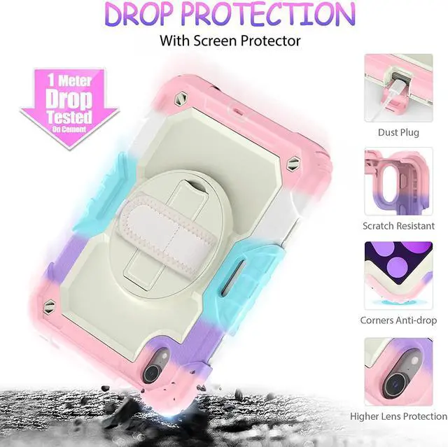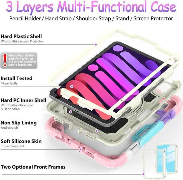 Full Body Protection with Screen ProtectorThe 3-layer protection case is composed of anti-skidding silicone outer shell and high-grade PC back cover with a built-in screen protector and port covers, providing your ipad mini 6th gen in full-body protection against accidental drops, scratch, impacts and shock.