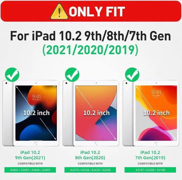 For iPad 10.2 CaseDesigned for iPad 9th/8th/7th Generation case 2021/2020/2019. Model Number : iPad 9th Gen (A2602,A2603,A2604,A2605) & iPad 8th Gen (A2270,A2428,A2429,A2430) & iPad 7th Gen (A2197,A2200,A2198). The Pencil is NOT included !