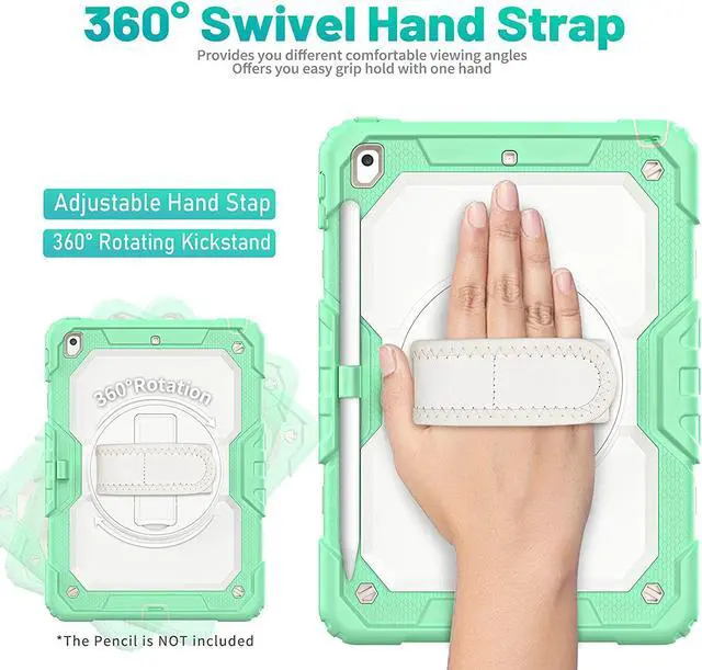 Rotating Hand Strap & StandThis 9th 8th 7th Gen case provides a stable supports, with viewing/drawing/typing angles. You can hold the iPad safely by one hand and find the most comfortable viewing angle you need. PS, the stand can be folded up when not in use.