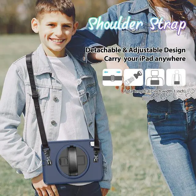 | Convenient Handle Strap & Shoulder Strap | - (1) The comfortable leather handle hand strap provides a horizontal/vertical mode to hold your iPad by one hand during work, study or journey. (2) The adjustable and detachable shoulder strap can help you carry your iPad more securely in outdoors or hang your iPad on car seat for kids watching video.