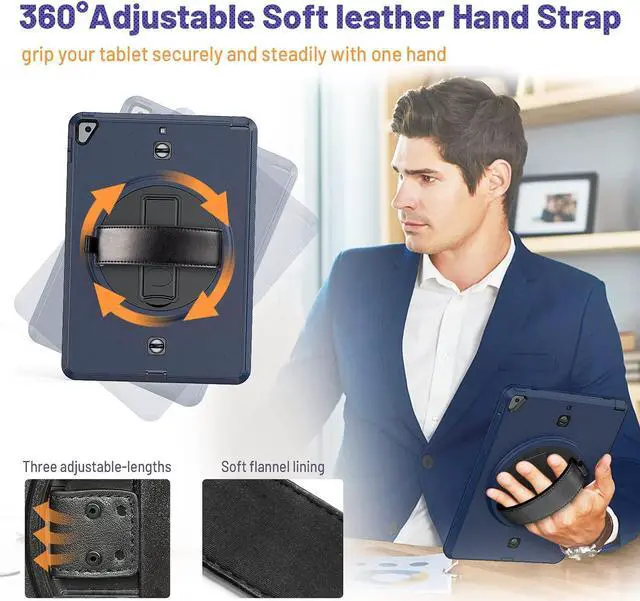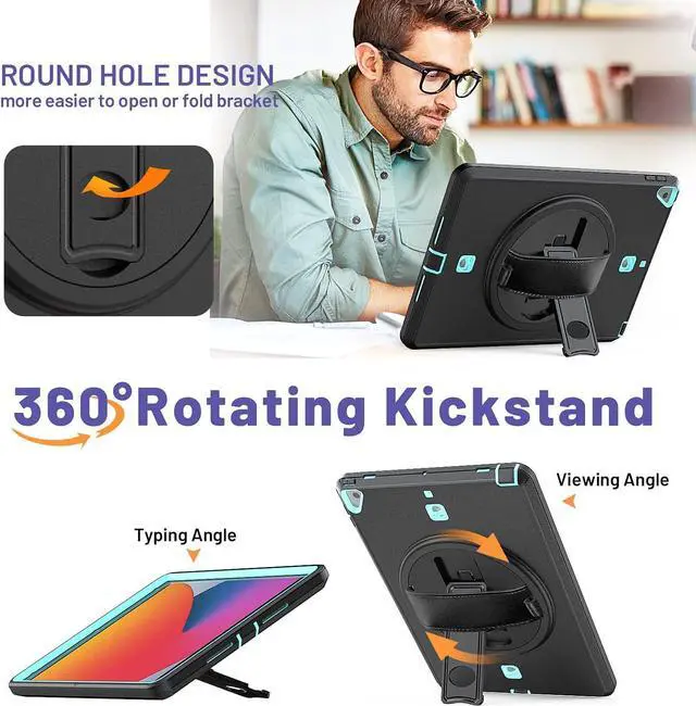 ? Swivel Kickstand & Premium Leather Hand Strap: (1)360 degree rotating kickstand offers a variety of angles for enjoying the most comfortable keyboard-typing and movie-watching, and the round hole design makes it easier for you to open or fold the stand.(2)The Premium leather hand strap with soft Flannel lining inside provides a comfortable and elegant experience when you hold your iPad 10.2 inch 2021 case. And the three adjustable-lengths of the handle is ideal for adults and kids.
