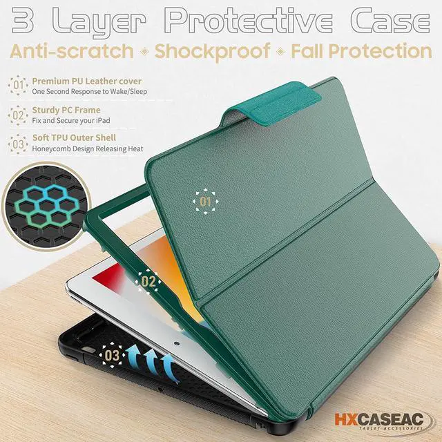 ?| DESIGN MEETS FUNCTION | - 3 layer protective case made of sturdy PC frame + soft TPU outer shell + front and back covered by premium durable PU leather. Features an elegant microfiber lining to keep all scuffs & scratches away from your iPad, and the inner layer is designed as a honeycomb air cushion help to keep your iPad 10.2 running cool.