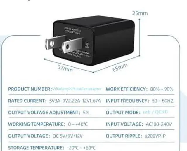Input:100-240V, 50-60Hz,3 IN 1 multi-function QC3.0 charger & 6ft MiniI 5P data charging cable, Output:(5V- 3A)(9V-2A), (12V-1.6A).