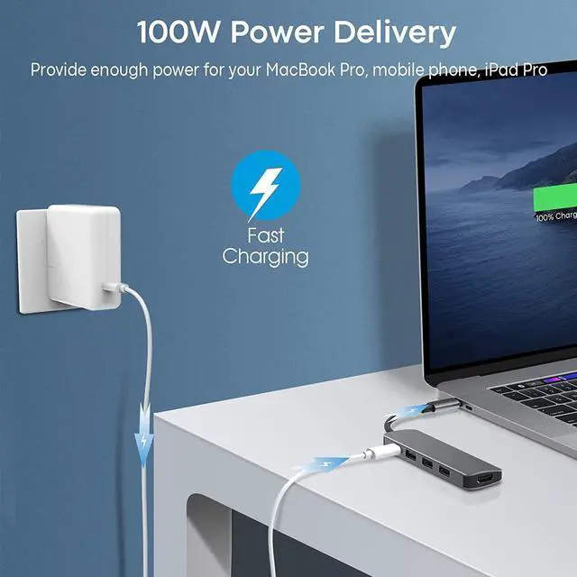 Super Fast-Through Charging,100W Power Delivery Supported,The USB C Hub supports a 100W USB C pass-through charging, ideal for MacBook Pro/Air or and other USB c devices