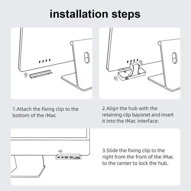 Plug and Play: 1. Attach the fixing clip to the bottom of the iMac. 2. Align the hub with the retaining clip bayonet and insert it into the iMac interface. 3. Slide the fixing clip to the right from the front of the iMac to the center to lock the hub