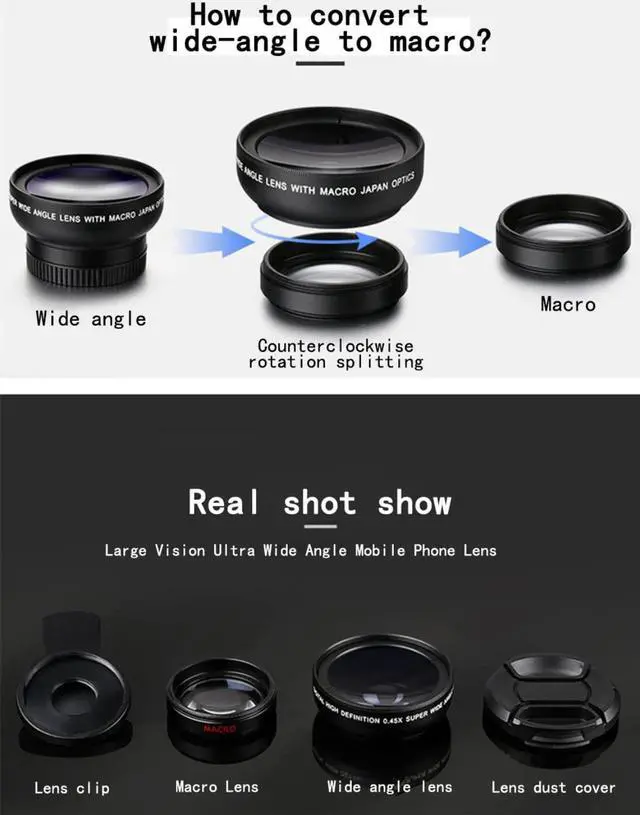* Perfect Function * -- This phone camera lens through a multi-functional mobile phone adapter clip, connected to the mobile phone, the shooting angle of the mobile phone can be expanded by 60% without any damage to the shooting image quality of the mobile phone.