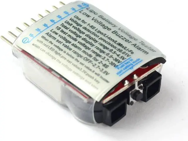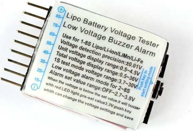 1S test mode voltage range: 3.7-30V Low voltage Buzzer alarm mode for 2-8S Alarm set value range: OFF-2.7V-3.8V Support Voltage settings and save Quantity: 50pcs