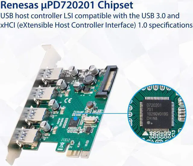 Provides USB 3.0 super-speed (5 Gbps) host port, backward compatible with USB 2.0 high-speed (480 Mbps), full-speed (12 Mbps), and low-speed (1.5 Mbps) interface