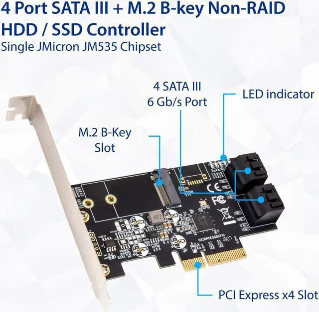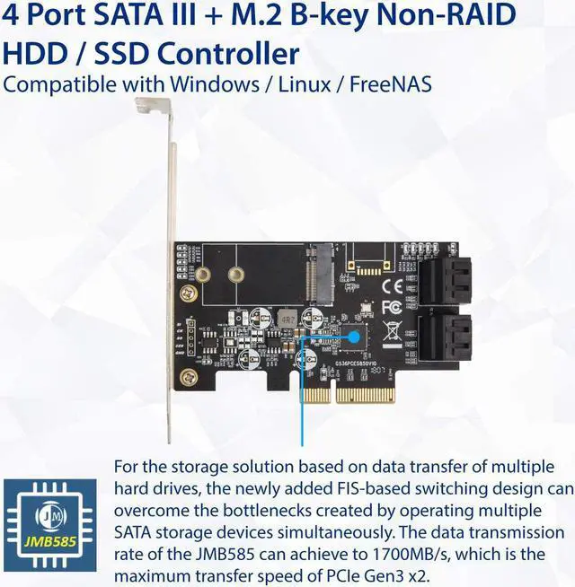 Connect four SATA drives and ONE M.2 B-Key SSD to any free PCI-E x4 Slot, providing up to 1700 MB/s Speed.