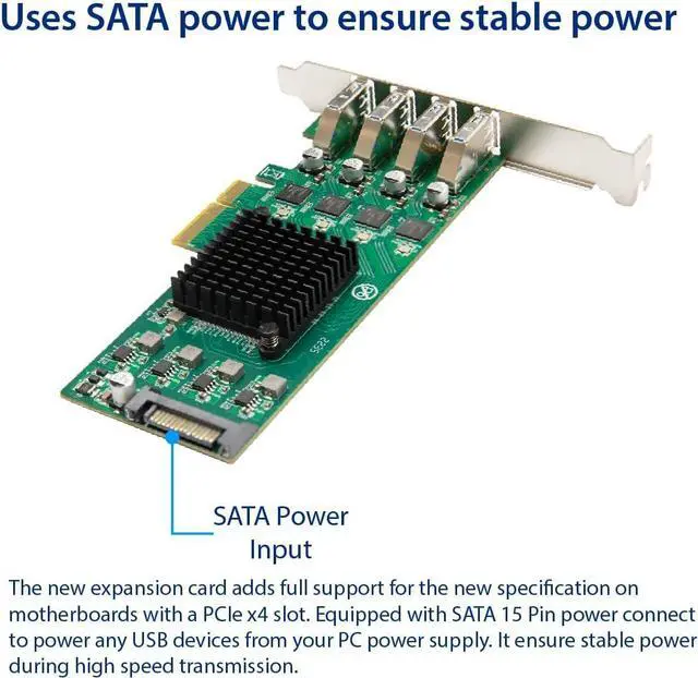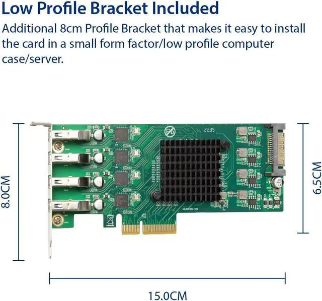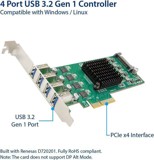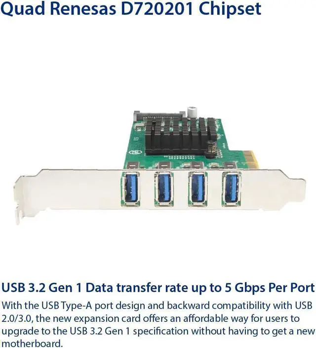 Add four USB 3.2 Gen 1 5 Gbps ports to your system. Powered by 4 Renesas D720201 controllers to provide dedicated 5 Gbps USB 3.0 transfer bandwidth for each port through PCIe 3.0 x4 host interface.