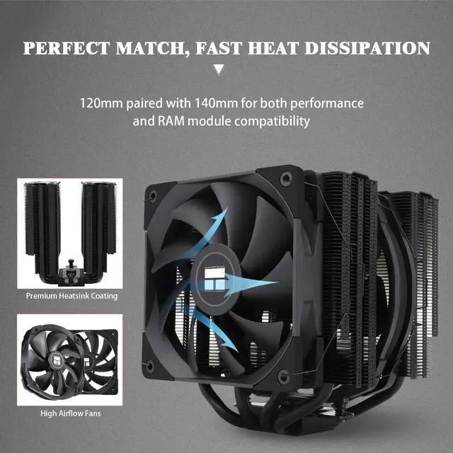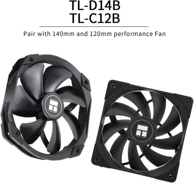 2 PWM FansTL-C12B and TL-D14B, Standard size PWM fan:120x120x25mm (4.72x4.72x0.98 inches) and 140x152x27mm (5.51x5.98x1.06 inches); fan speed (RPM):1500rpm±10% ; power port: 4pin; Voltage:12V; Air flow:66.17/77.8CFM(MAX); Noise Level25.6dB(A). The high speed of the dual fans will greatly improve the cooling effect, which can easily take away the hot air and prevent the CPU from running normally due to high temperature.