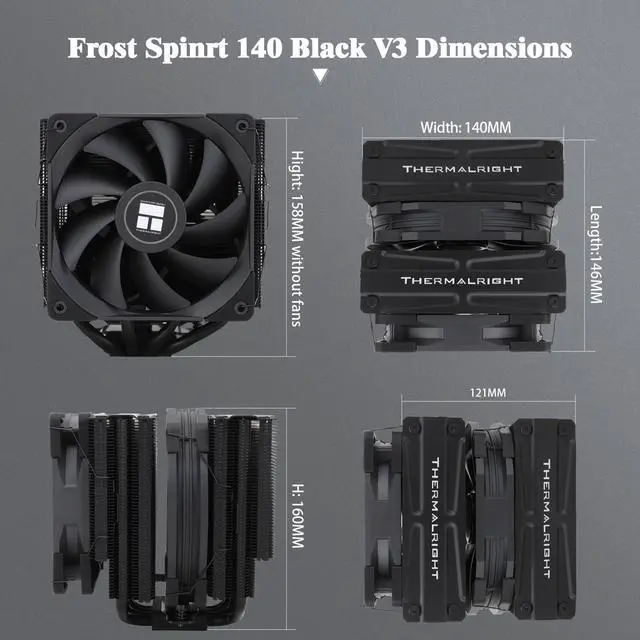 Product specificationThermalright FS140 BLACK V3; CPU Cooler dimensions: 140(L)x146(W)x160(H)mm (5.51x5.75x6.3inch); Product weight:1.31kg(2.89lb); heat sink material: aluminum, CPU cooler is equipped with metal fasteners of Intel & AMD platform to achieve better installation. The offset asymmetric layout is allowed to installation on first graphics card slot, and the height is compatible with memories within 62mm.