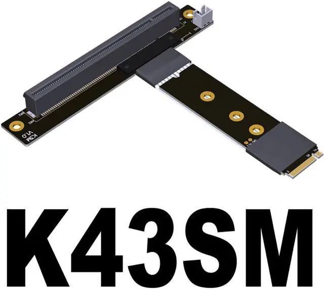 K43ST: M.2 key-M NVMe to PCIe x4 turn 180 degree splint vertical extension cables. K43SM: M.2 key-M NVMe to PCIe x4 turn 90 degree extension cables. K43SP: M.2 key-M NVMe to PCIe x4 turn 90 degree extension cables connector lock version.